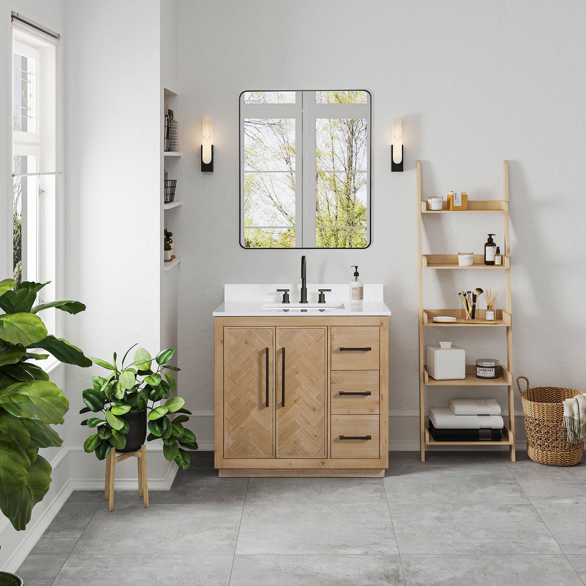 Looking for a light, bright, and natural sense of your bathroom? Bellavia vanity features with weathered fir that showcases a unique and rustic charm. Finely handcrafted jointing door front with a chic chevron pattern creates a modern and sophisticated aesthetic. By creating a recessed plinth base at the bottom, enhance the visual appeal and sophistication of space. With a beautifully marbled engineered stone countertop, our vanity adds class, distinction, and functionality to any guest or master bath in your home.
