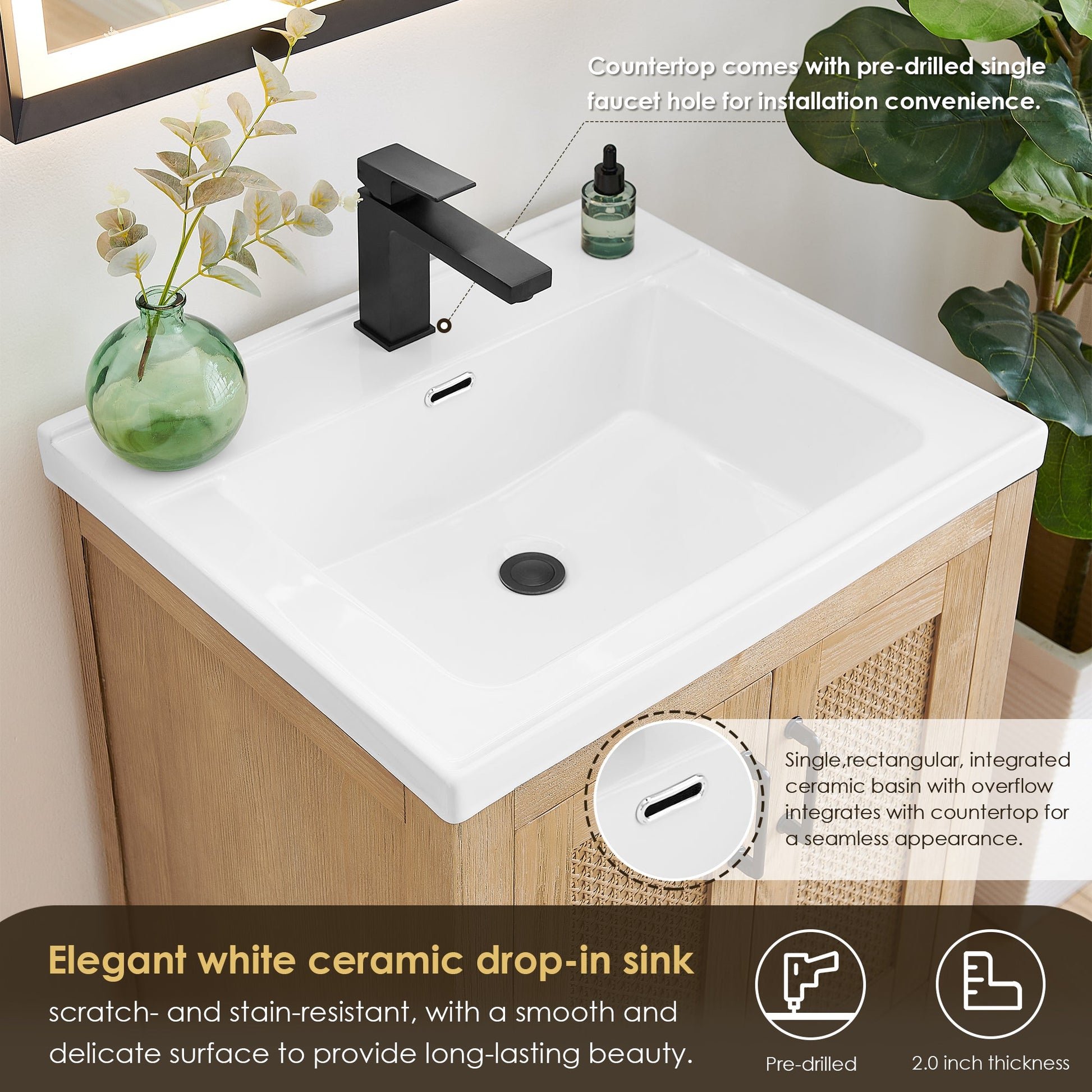 - Elegant white ceramic countertop, scratch- and stain-resistant, with a smooth and delicate surface to provide long-lasting beauty