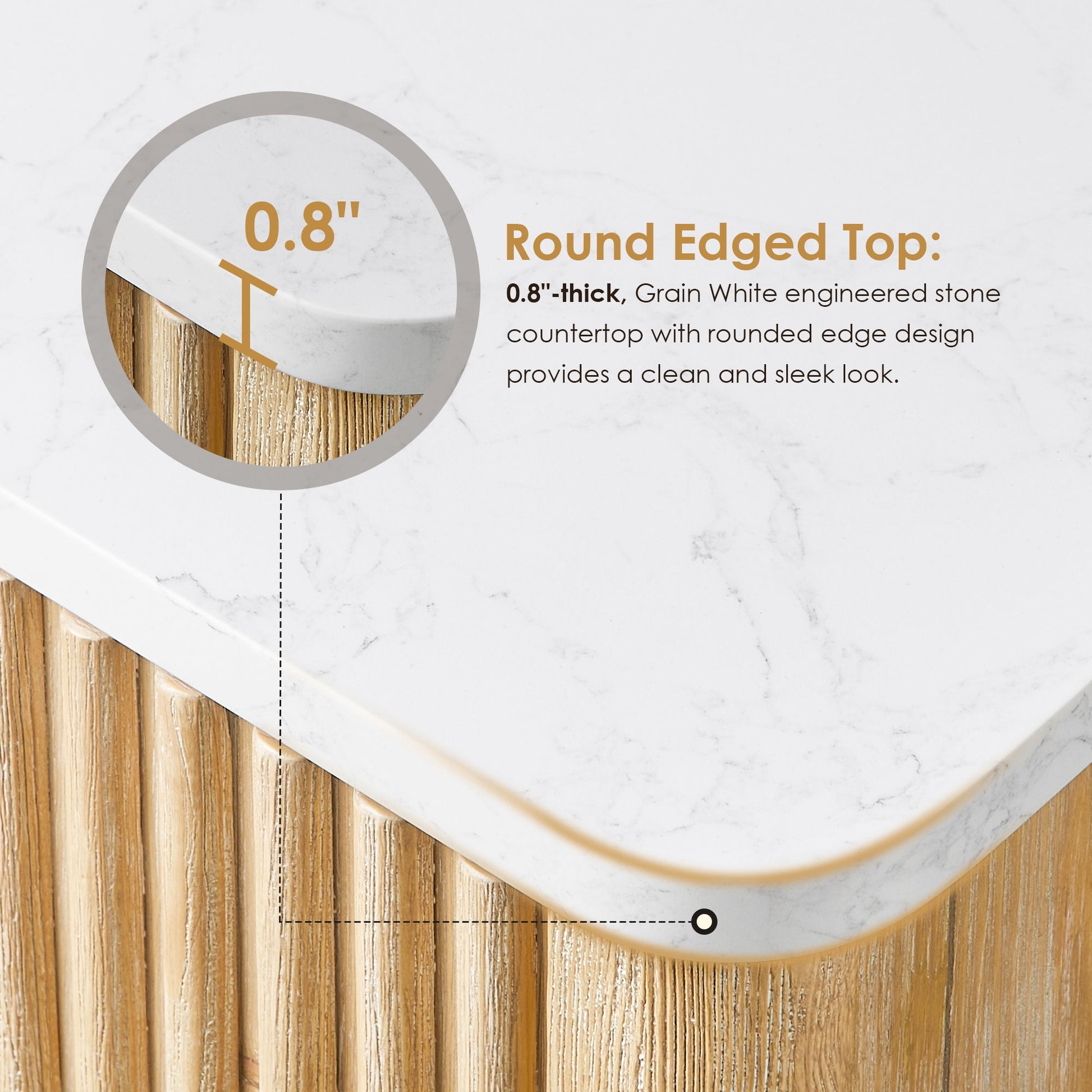 - Round Edged Top : 0.8”-thick, Grain White engineered stone countertop with rounded edge design provides a clean and sleek look, with an optional 4” backsplash to protect walls from sink splashes.