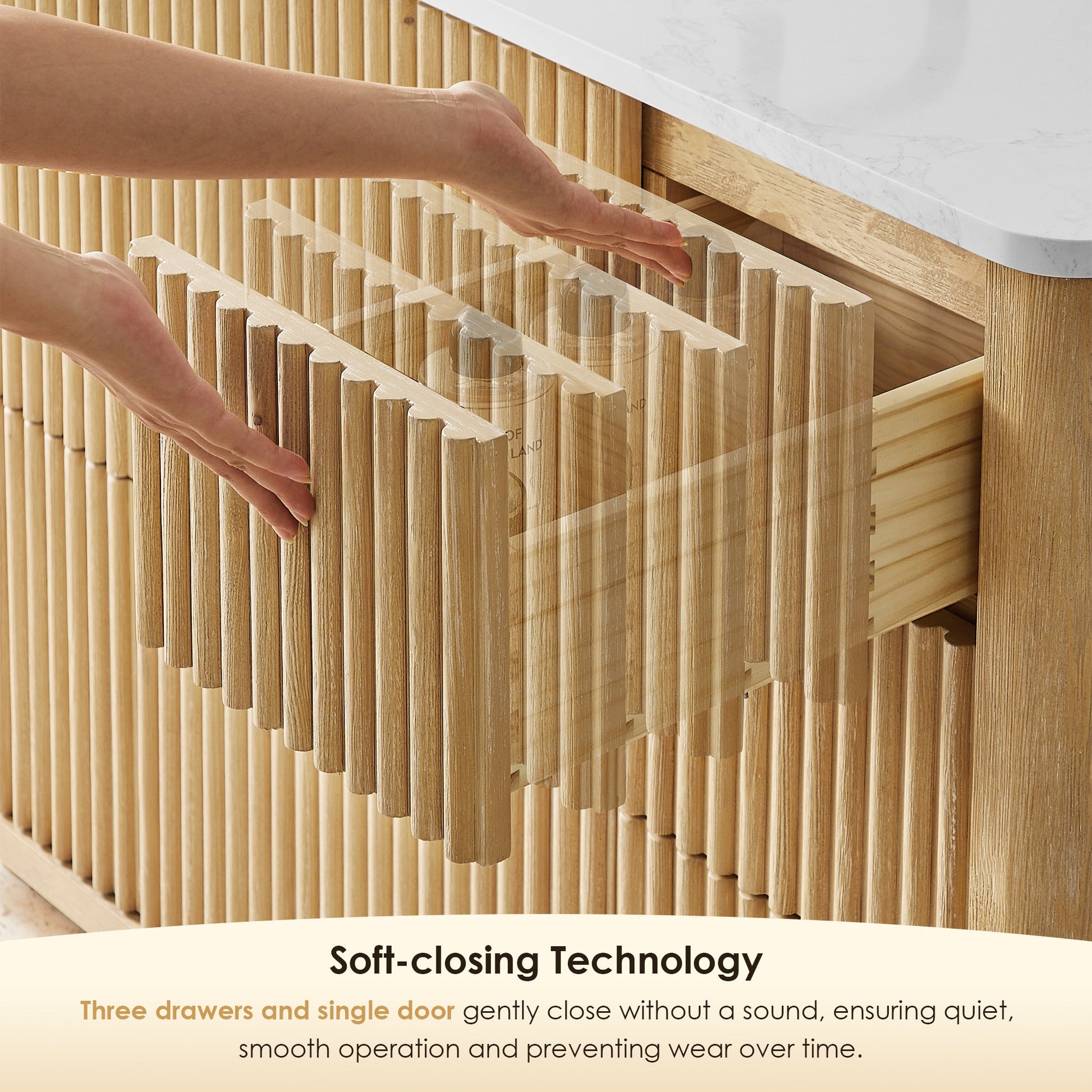 Our timeless Clayton vanity combines modern design with exceptional functionality, featuring a washed finish that adds a touch of warmth and softness to your bathroom. The drawer and door panels are adorned with solid reeding, showcasing elegant detailing that creates subtle shadows, enhancing the piece with added depth and visual contrast. The smooth countertop, with its rounded edges, displays a refined, contemporary charm, perfectly highlighting the sophisticated designed grain lines. Thoughtfully crafted for your convenience, this innovative design features a push-to-open and close mechanism, a sleek handle-free aesthetic, a dedicated hair dryer organizer, and built-in UL-listed power and USB outlets, ensuring effortless access and organized storage.