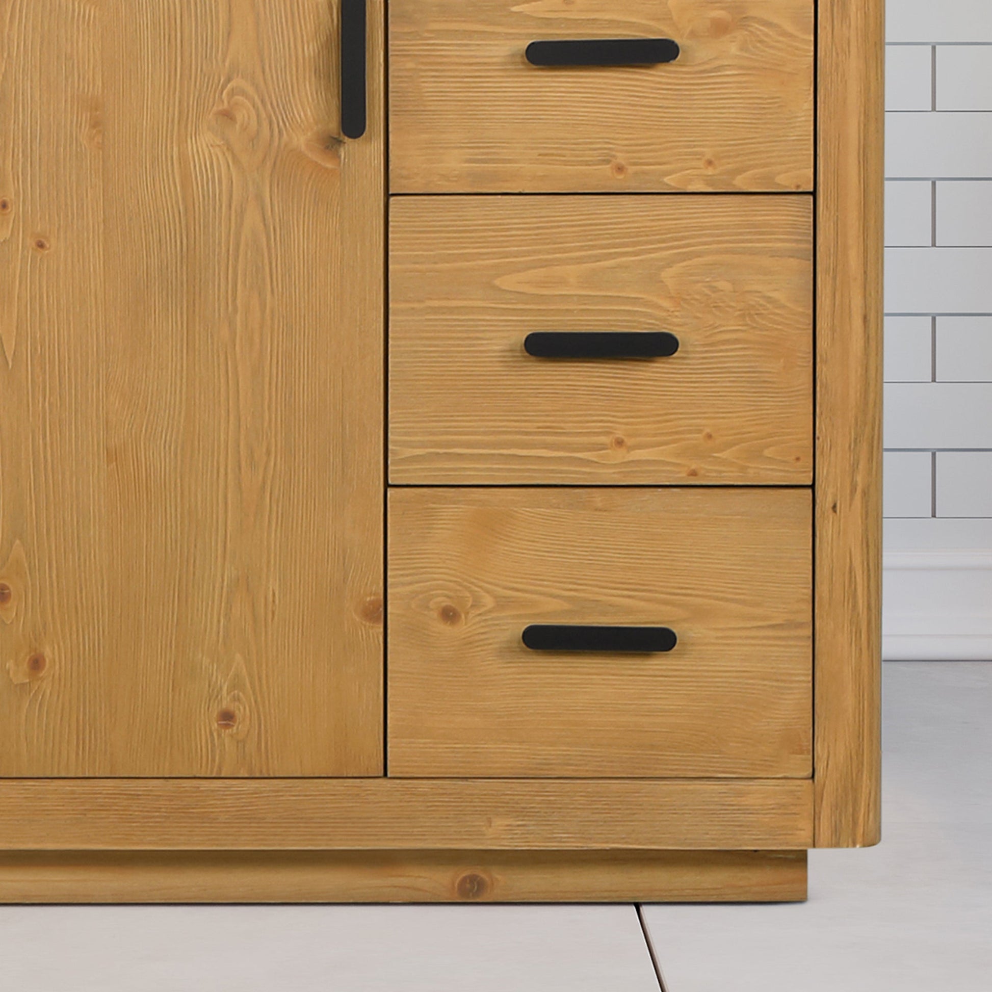 Stylish in its simplicity, our eye-catching Perla vanity infuses your guest or master bath with classic elegance. The richly grained cabinet evokes a warm, woodsy feel, contrasted with the bold black shade of the pull handles. Crafted of gorgeous composite stone, the Perla’s vanity top features rich veining and more than enough surface area for soaps and other bathroom accessories. A smooth-gliding door and drawers provide optimal concealed storage space, lending everyday practicality to this distinctive piece.