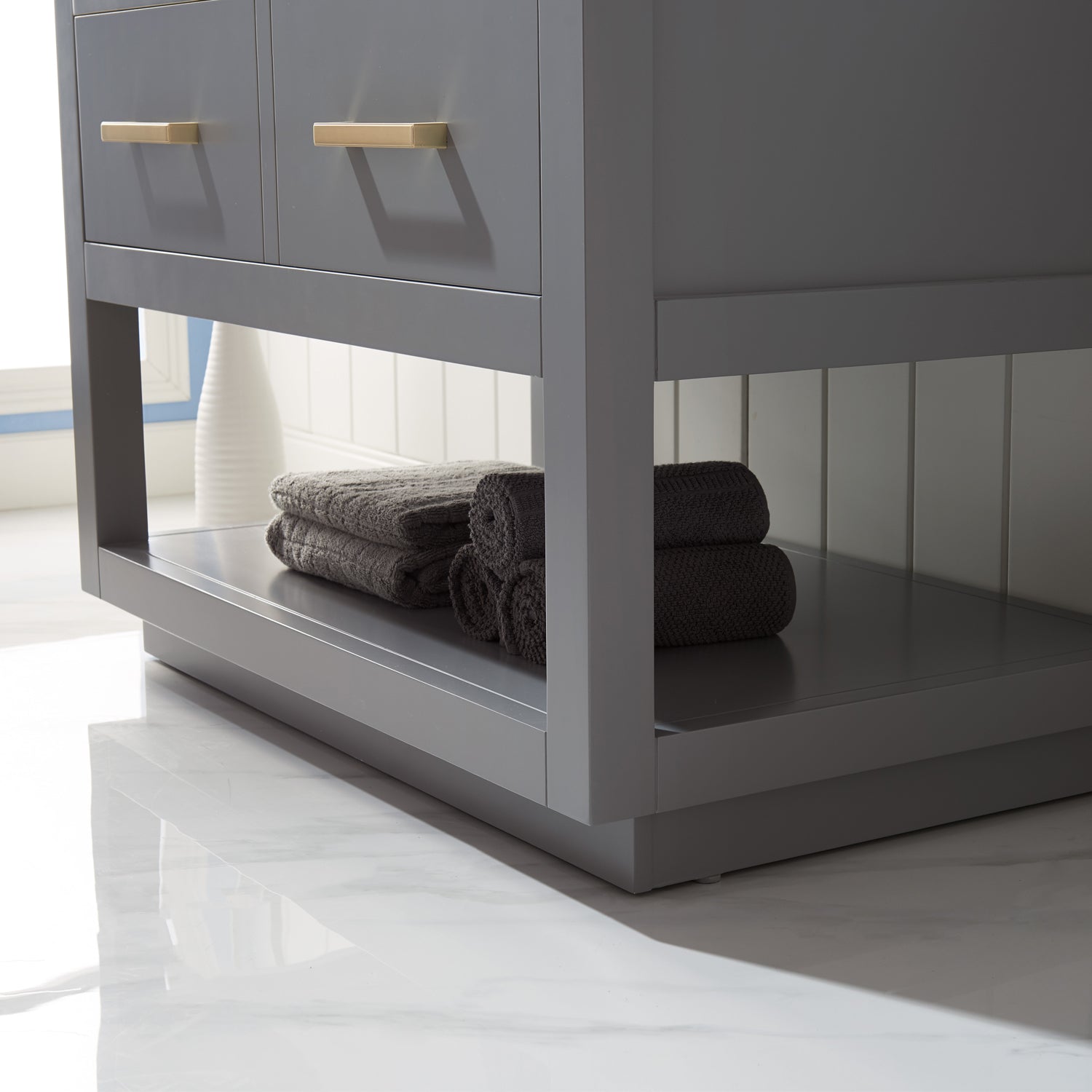The Remi Vanity is proof that sometimes the simplest designs make the most powerful impact. With its clean silhouette and modern charm, this piece features a genuine marble countertop that contrasts beautifully with the minimalist cabinetry. The open shelf below offers the perfect storage space for spa towels and decorative items.