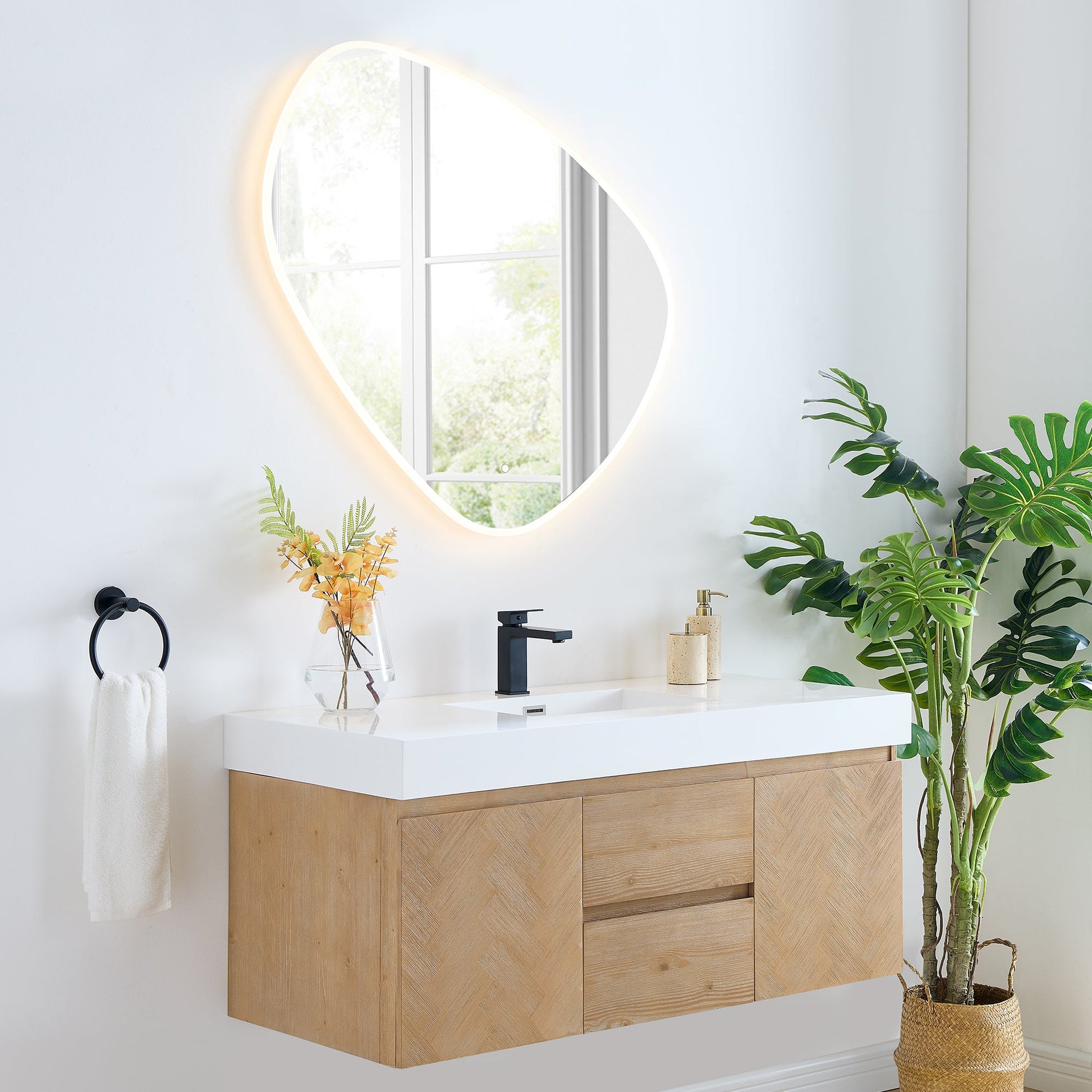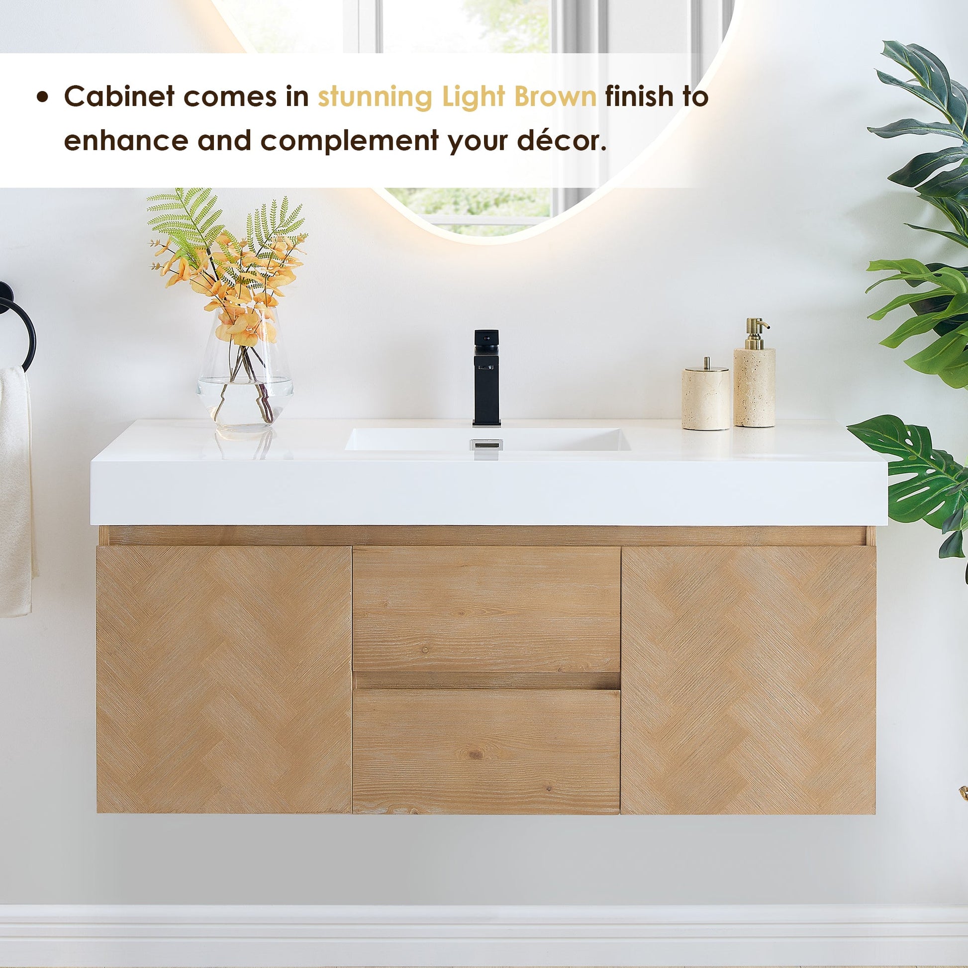 Blending warmth and texture with its light brown finish and elegant chevron pattern, Siena Vanity transforms your guest or prime bath into a relaxing oasis. Designed for convenience, its 45° inclined-edged door panels and handcrafted jointing allow for a comfortable and smooth operation. Immerse yourself in a luxury experience with our clean wall-mount design and crisp white integrated artificial drop-in sink that is moisture-resistant and easy to maintain.