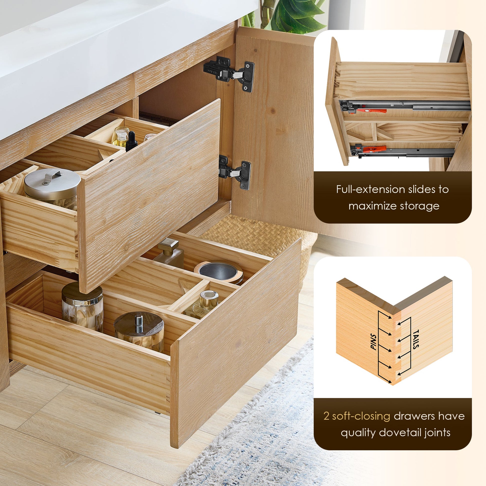 - 2 soft-closing built-in bridge drawers with dovetail joints for easy plumbing installation and removable partition compartments for storage